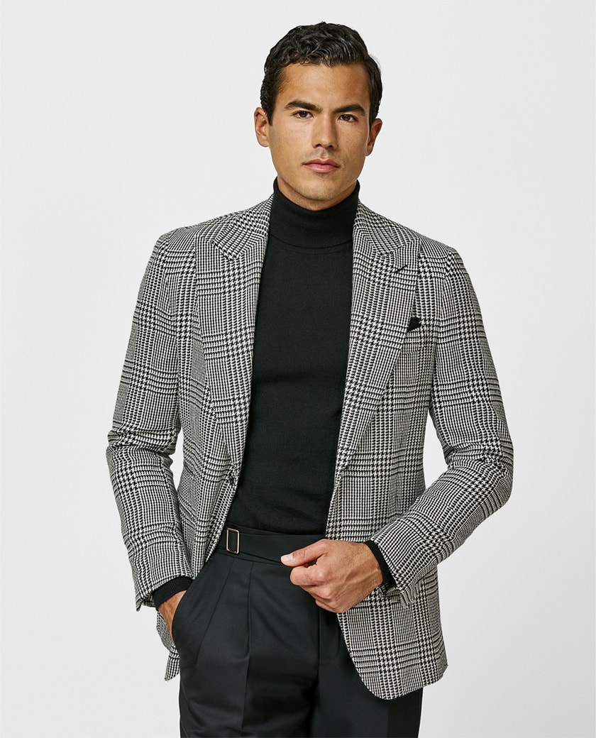 For a distinctive winter staple, look to the midnight and off-white houndstooth jacket. Woven from a sophisticated mix of 3-ply merino wool, baby alpaca, and silk, it delivers warmth with an intriguing texture and soft touch. For holiday style, pair it with a turtle neck, tailored trousers, and black penny loafers to strike the perfect balance of tonal refinement. Double-breasted with peak lapels and handmade details, this is a piece that embodies modern elegance while allowing you to make it your own through custom finishes.