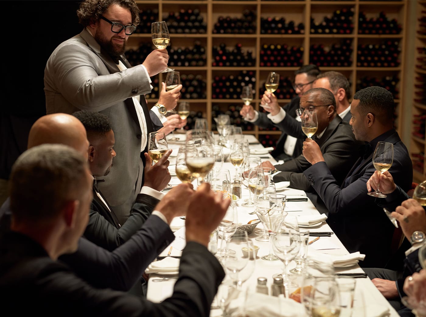 This year we convened in Toronto, making our way downtown to an institution, one of the city’s most esteemed restaurants: Barberian’s Steak House. Full of warm timber and white tablecloths, entering feels like you’ve been transported to another time. Local style advisor Vince had suggested the private dining room there. Upon walking into the beautiful cellar, walls stacked with over 15,000 wine bottles, a glass chandelier at the center, we were glad he did. We welcomed fourteen guests – some old friends, some new, and a couple from our own team – each dressed in their own black-tie attire curated specially for the event. Looking around the long table, we were filled with pride to see such an eclectic mix of styles, from the effortlessly classic to incredibly bold – everyone expressing only themselves.