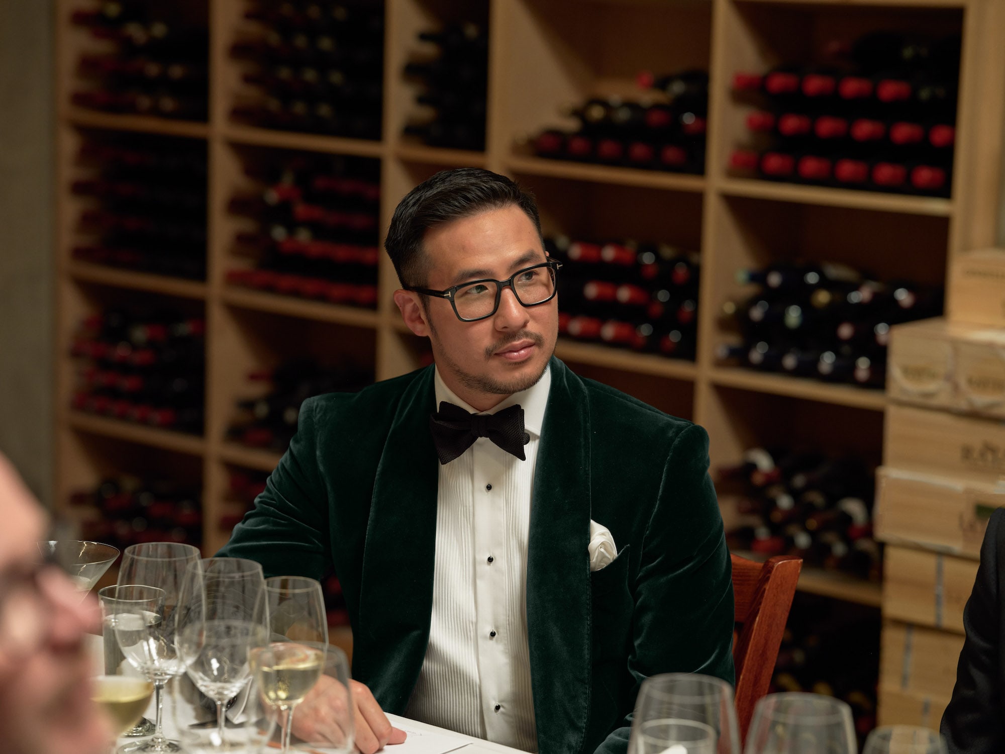 We also invited Vince’s long-time client and friend, Realtor Brett Starke. The two have been working together for years, most recently on his looks for the Amazon Prime reality series Luxe Listings Toronto. When asked how he felt at dinner, Brett replied, “I feel like myself, but poised, more confident, and with better posture.” He was certainly standing tall in his wool-mohair tuxedo in a timeless midnight blue. Not one to shy away from the spotlight, he opted for a strong silhouette: the double-breasted jacket with wide peak lapels.