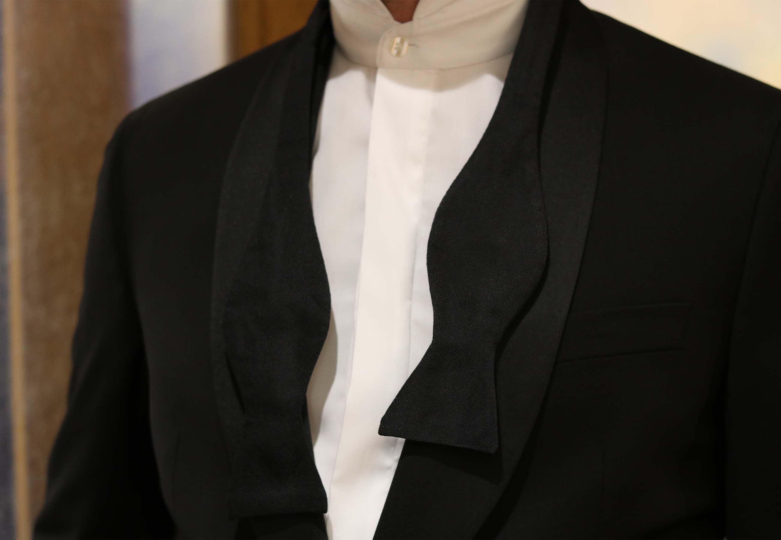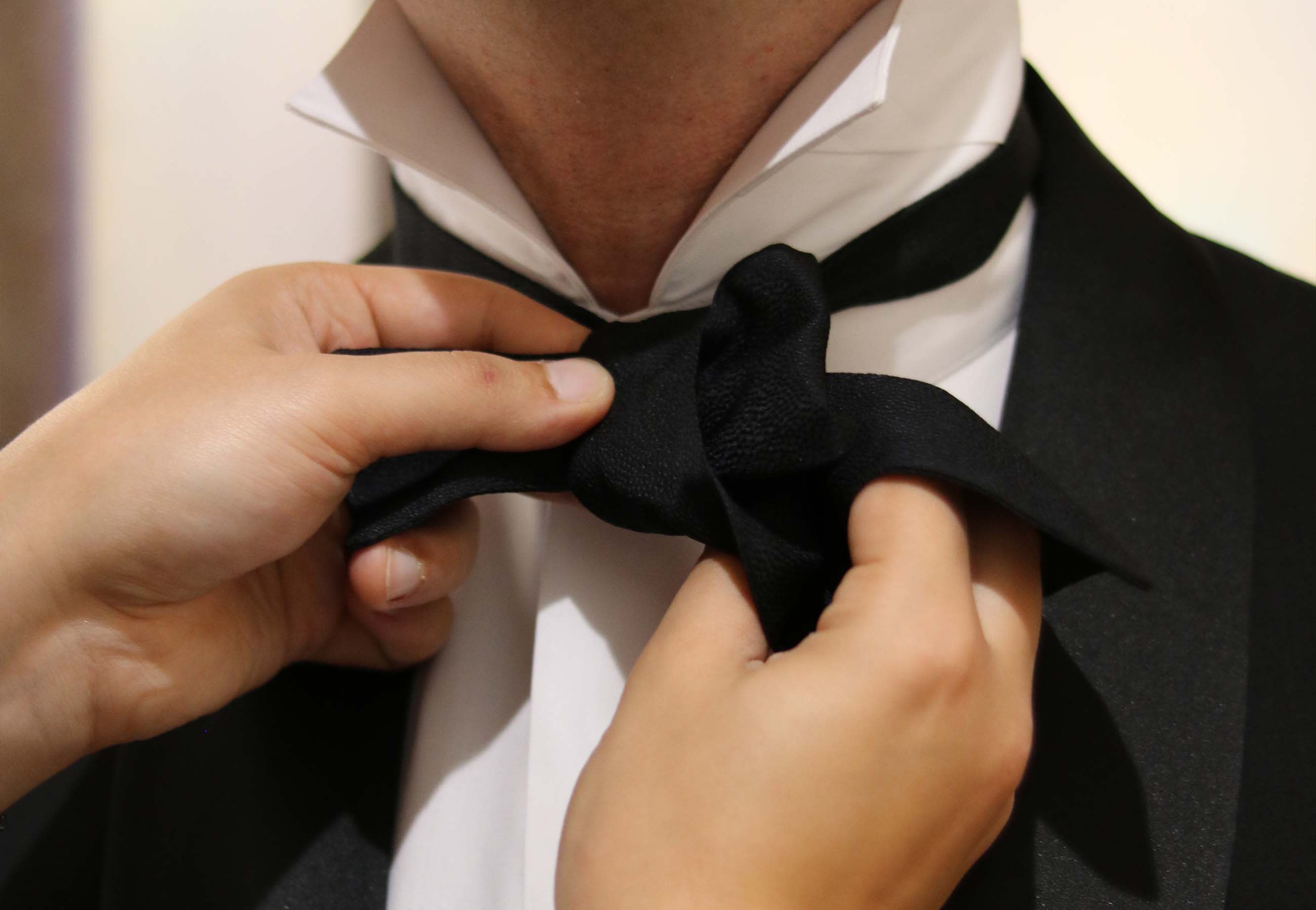 “The easiest way to tie your bow tie is to do it around your leg first. Your thigh is usually a similar width to your neck and this way you can see what you are doing!”