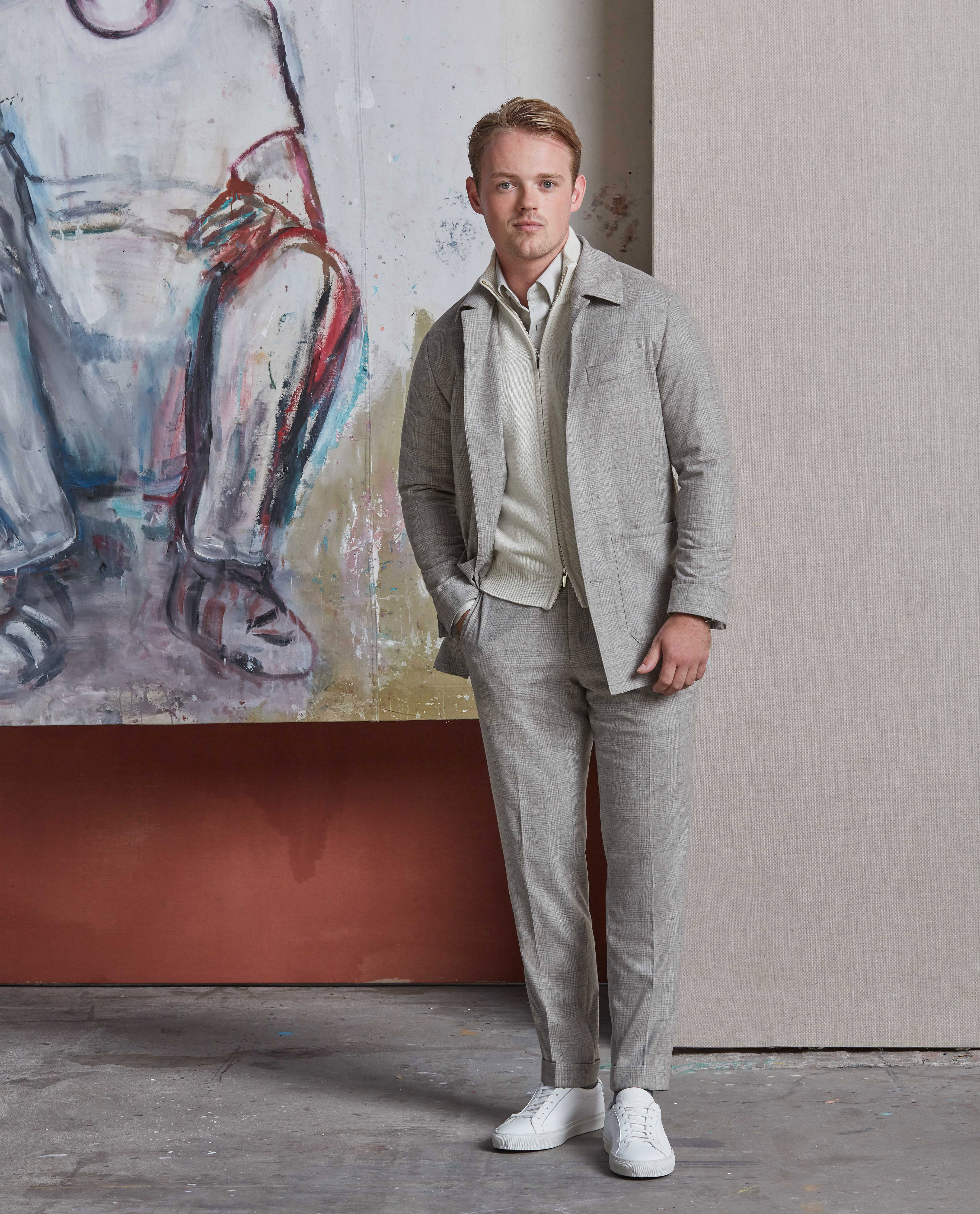 I love how this outfit is casual and elevated at the same time. I think the colors are nice and fresh, and especially good for the fall to counter all the darker tones around you. I really love the fabrics of this look too. The soft touches of the flannel shirt, combined with the cashmere knit and the wool-cashmere lightweight suit makes it a warm and comfortable outfit. It’s perfect to wear on a date. I can see myself going to an amazing wine bar in Amsterdam where they serve incredible food. Just need to be careful with that red wine!