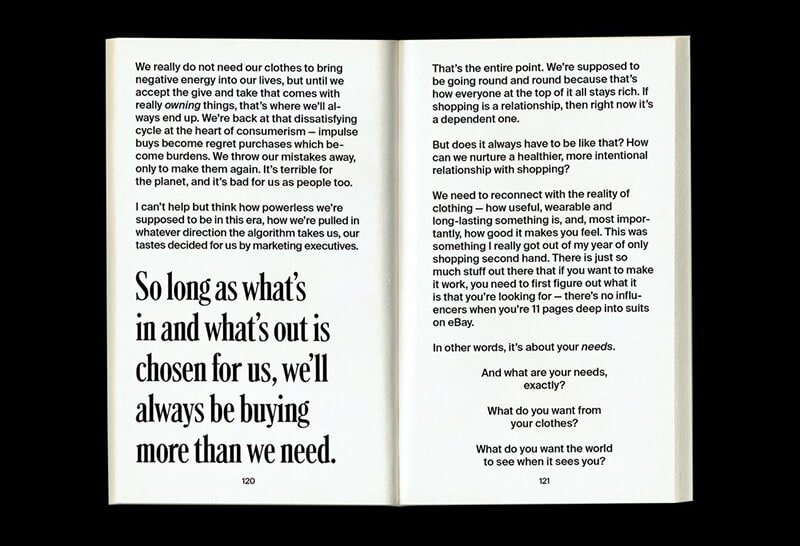 It’s written by Alec Leach, who left renowned fashion platform Highsnobiety to pursue the writing along with his own more sustainable platform Future Dust. The former editor takes an honest look at concepts like consumerism, greenwashing, mindfulness and explores why the problem lies with many different stakeholders within the industry. It’s not all doom and gloom though, the Berlin-based writer is serving up hope with his truth bombs.