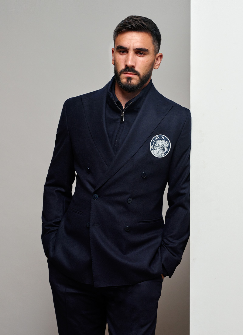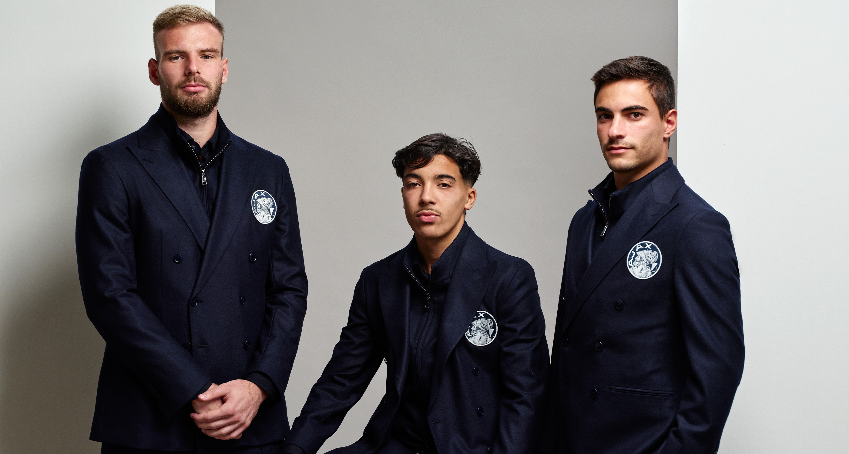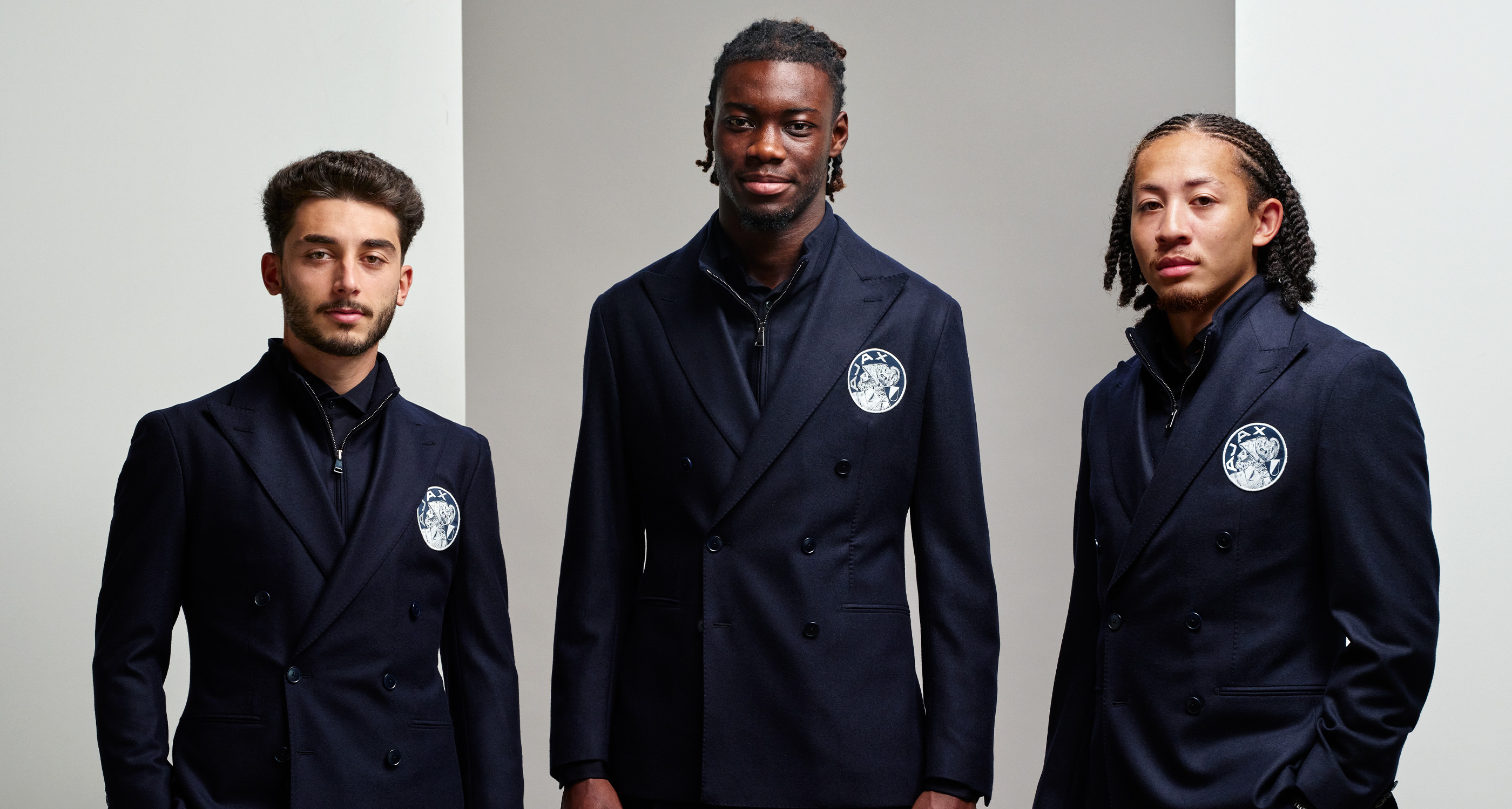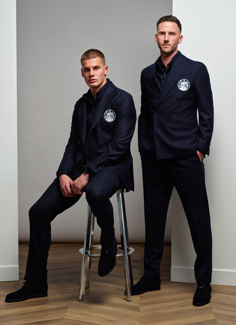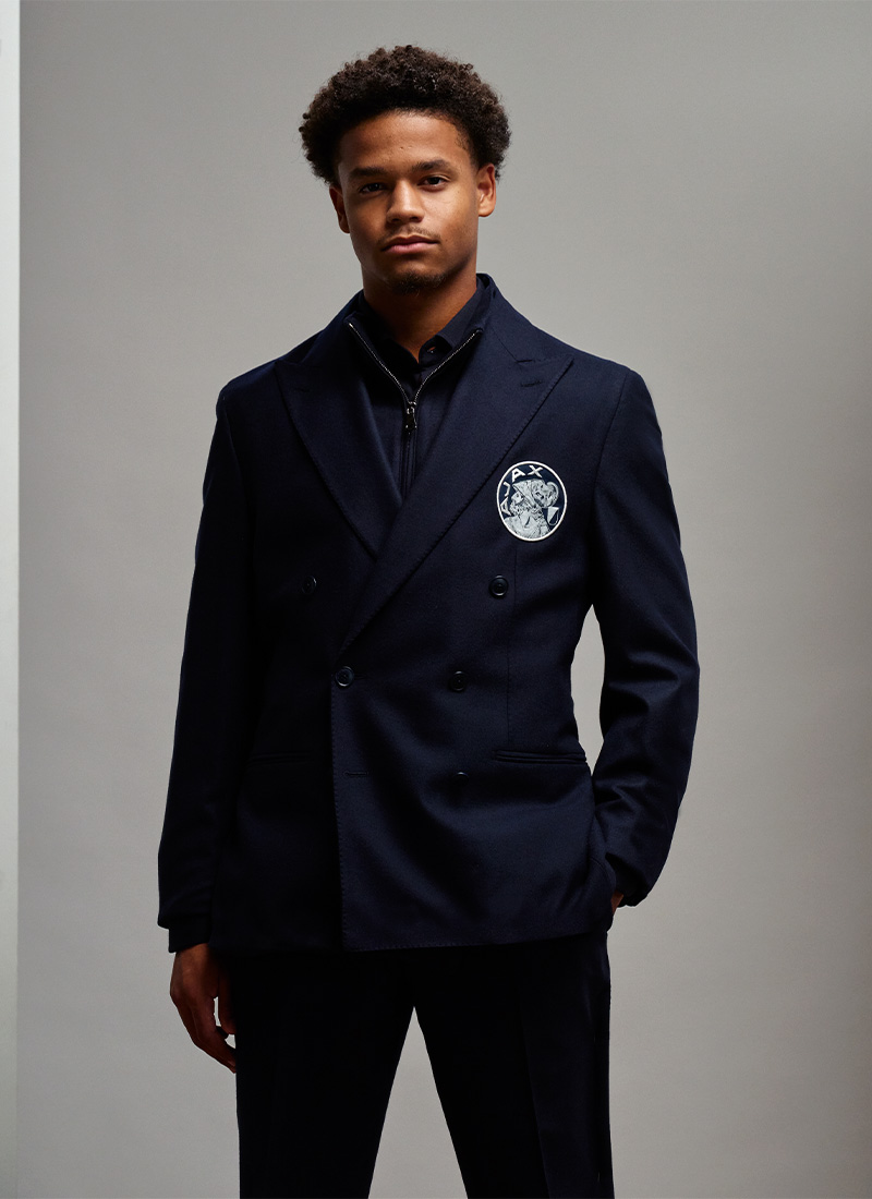 Atelier Munro, continuing as Ajax’s Official Formal Wear Supplier, has created a new look exclusively for the men’s first team. A revival of classic Ajax style: sharp, confident, and unmistakably iconic. This season, Ajax 1 will wear double-breasted midnight blue suits, crafted from Jersely fabric made in Italy by Loro Piana, a nod to enduring sophistication. Each suit carries subtle yet powerful details: the classic Ajax crest, restored after years of supporters requesting its return on the jersey, now also making its way to the team’s formalwear, underscoring the deep connection between tradition and progress. To complement this, the look also includes a modern vest with a zipper in the same refined fabric as the suit. It adds a touch of modernity and versatility, allowing players to adapt their look to personal preference while maintaining a united appearance.