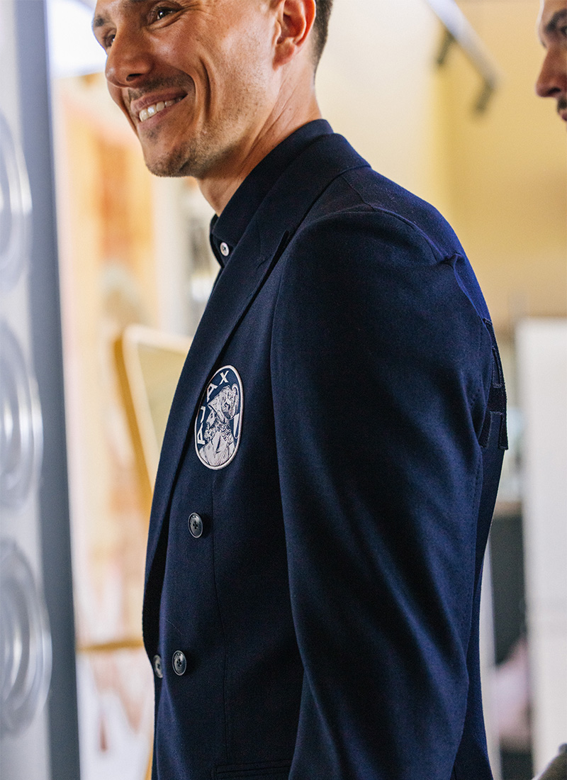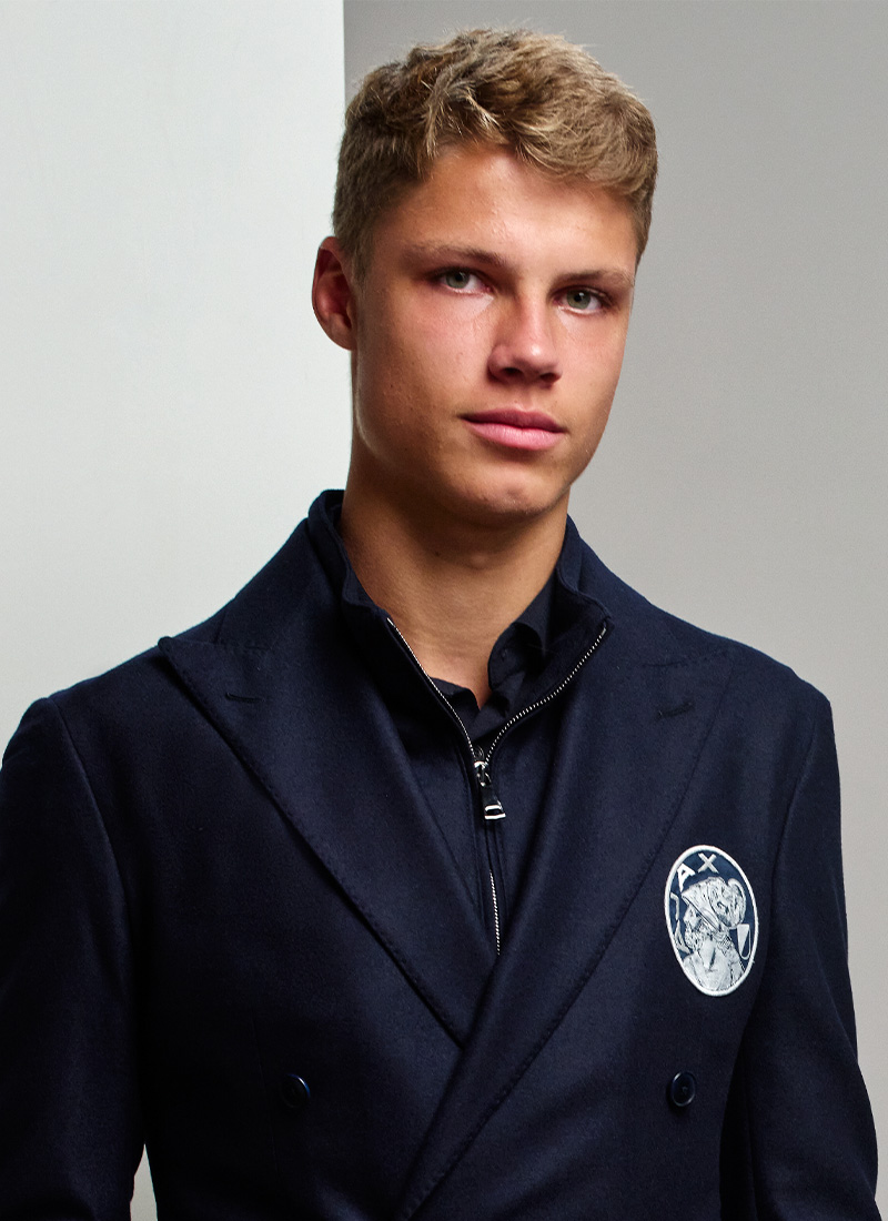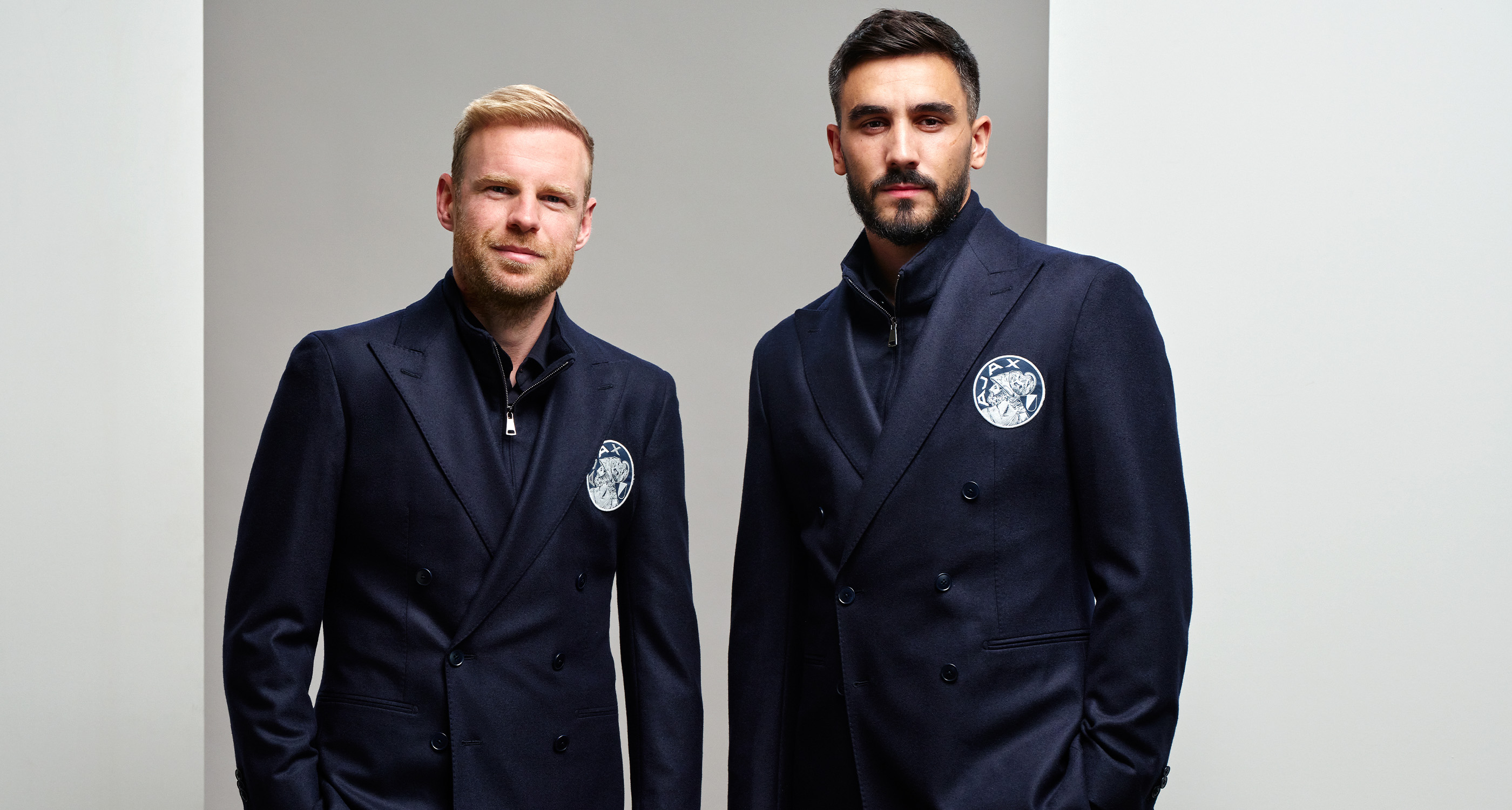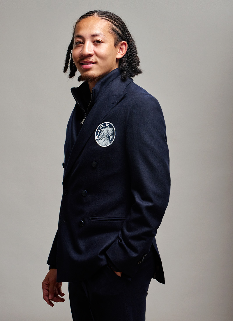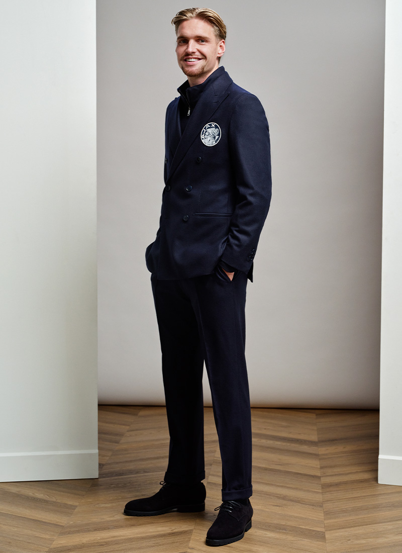 Atelier Munro, continuing as Ajax’s Official Formal Wear Supplier, has created a new look exclusively for the men’s first team. A revival of classic Ajax style: sharp, confident, and unmistakably iconic. This season, Ajax 1 will wear double-breasted midnight blue suits, crafted from Jersely fabric made in Italy by Loro Piana, a nod to enduring sophistication. Each suit carries subtle yet powerful details: the classic Ajax crest, restored after years of supporters requesting its return on the jersey, now also making its way to the team’s formalwear, underscoring the deep connection between tradition and progress. To complement this, the look also includes a modern vest with a zipper in the same refined fabric as the suit. It adds a touch of modernity and versatility, allowing players to adapt their look to personal preference while maintaining a united appearance.