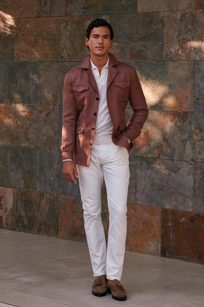 Introduce a nature-inspired touch of green into your wardrobe for a modern take on accent colors. Green long been a symbol of growth and renewal, making it a perfect choice for spring menswear – energizing your wardrobe and connecting you to the vibrant hues of nature in full bloom during the season. A forest green pencil stripe suit combines outstanding breathability with a subtle, elegant shine. When styling a statement jacket, anchor your look with complementary tones for a polished, cohesive ensemble – like the striking green outfit, pictured below.