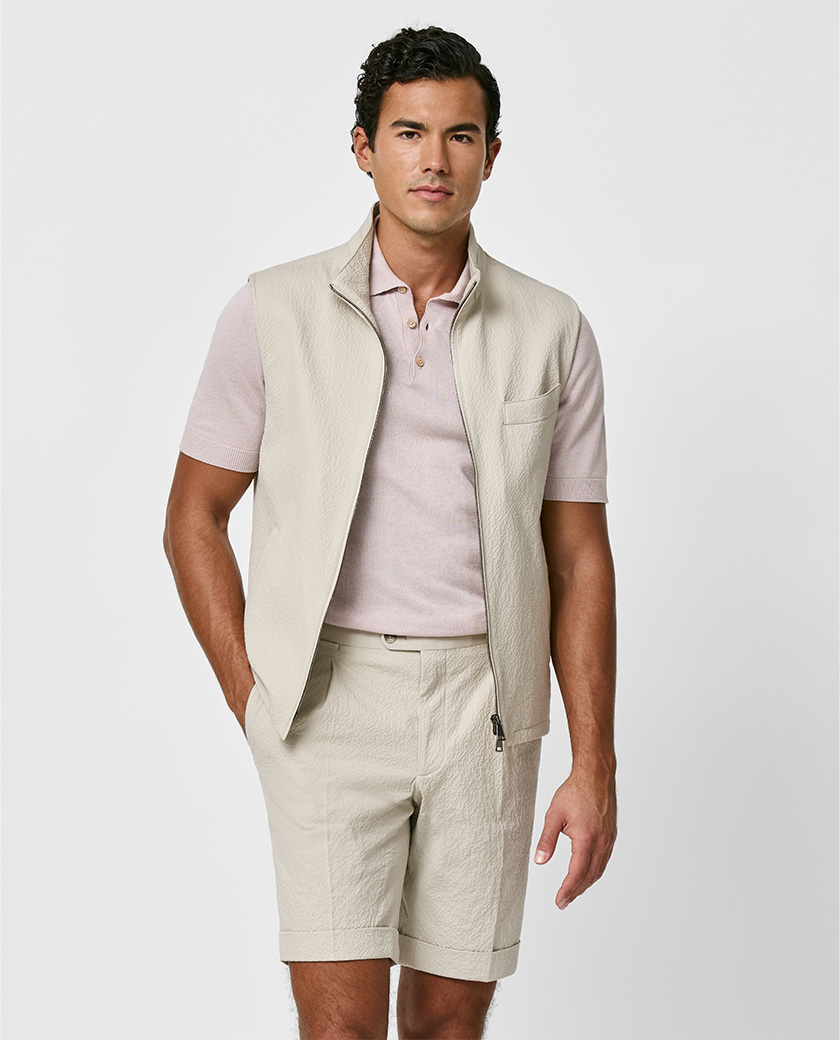 Layer your summer wardrobe with versatility in mind. Our Taupe Stretch Wool-Silk-Linen Vest, crafted from Summertime Move® fabric made in Italy by Loro Piana, keeps you looking refined while feeling incredibly light and breathable. Pair it with a summer knit or linen Bermudas for a look that works from casual brunches to evening drinks.